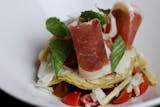 fresh burrata filled with black and white truffle cream, grape tomatoes, prosciutto di Parma, basil
